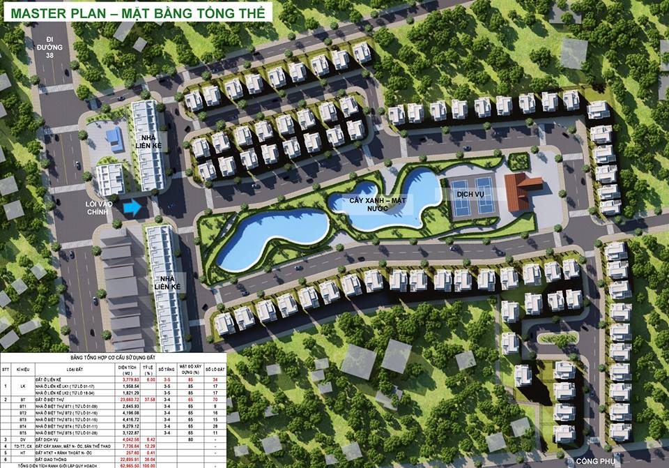 - Đất cây xanh, mặt nước, thể thao: 7,736.64m2