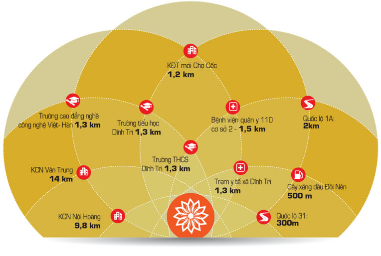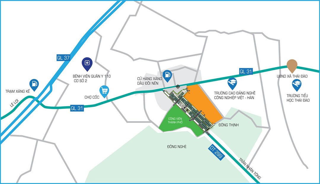 - Tọa lạc tại vành đai kinh tế phía Đông của thành phố Bắc Giang, trên đường tỉnh lộ DT299, cách Quốc lộ 1A chưa đầy 2km, khu đô thị Dĩnh Trì sở hữu vị trí chiến lược, thuận tiện nhất để kết nối nhanh chóng với các hệ thống tiện ích và hạ tầng xã hội của thành phố Bắc Giang.