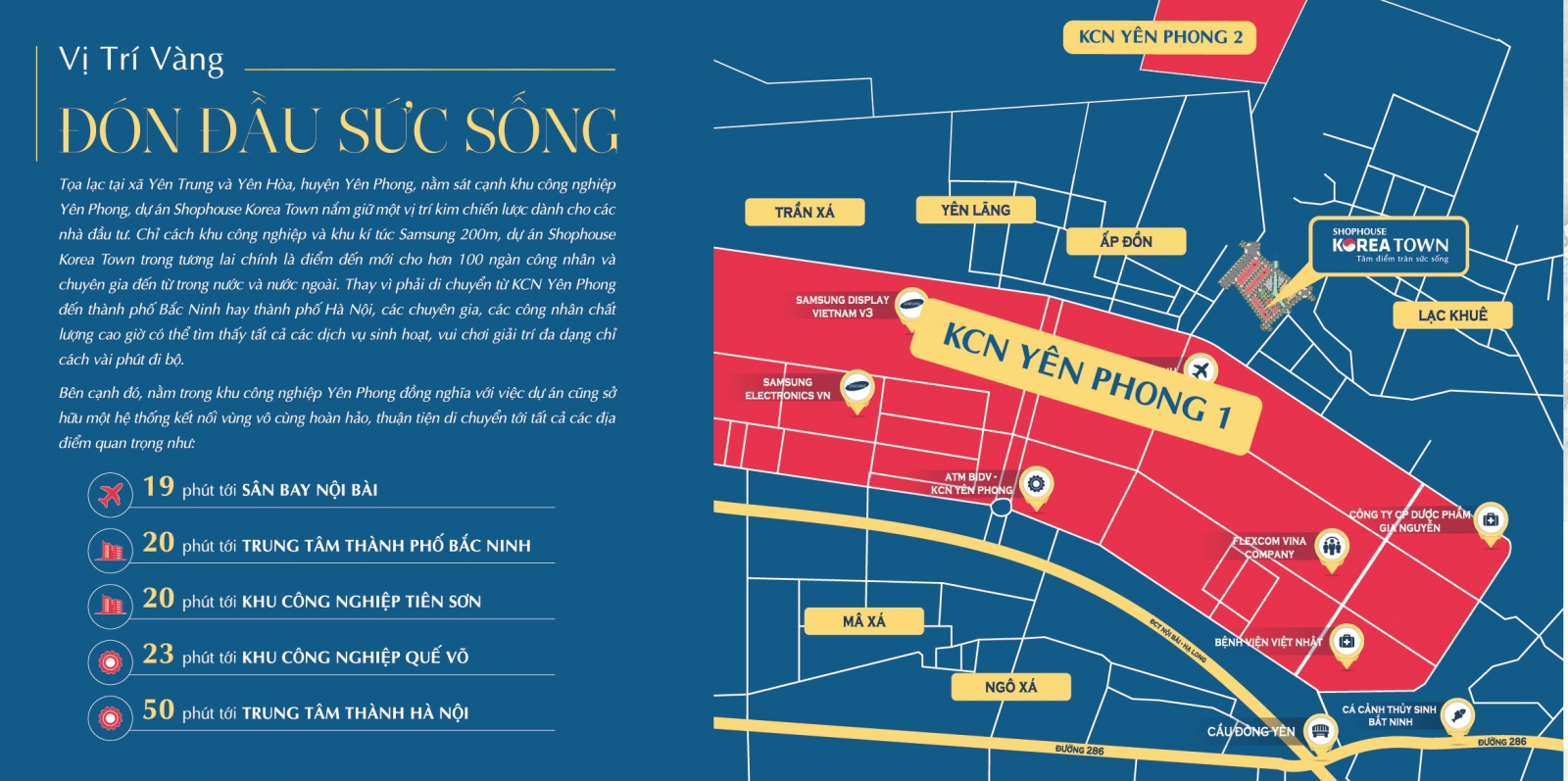 - Shophouse Korea Town Bắc Ninh nắm giữ một vị trí kim chiến lược dành cho các nhà đầu tư. Chỉ cách khu công nghiệp và khu kí túc Samsung 200m, dự án Shophouse Korea Town trong tương lai chính là điểm đến mới cho hơn 100 ngàn công nhân và chuyên gia đến từ trong nước và nước ngoài. Thay vì phải di chuyển từ KCN Yên Phong đến thành phố Bắc Ninh hay thành phố Hà Nội, các chuyên gia, các công nhân chất lượng cao giờ có thể tìm thấy tất cả các dịch vụ sinh hoạt, vui chơi giải trí đa dạng chỉ cách vài phút đi bộ.