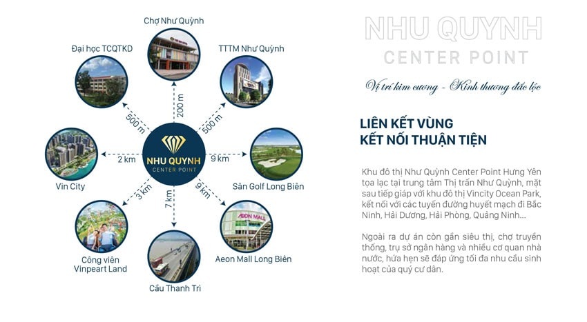 - Khu đô thị Như Quỳnh Center Point là dự án nằm ngay Trung tâm Thị trấn Như Quỳnh, kết nối trực tiếp với QL5A và QL388 chạy liên tỉnh sang Bắc Ninh, Hải Dương, Hải Phòng,….; Được thừa hưởng tiện ích trực tiếp từ Dự án Vincity Ocean Park (Gia Lâm, Long Biên, Hà Nội).