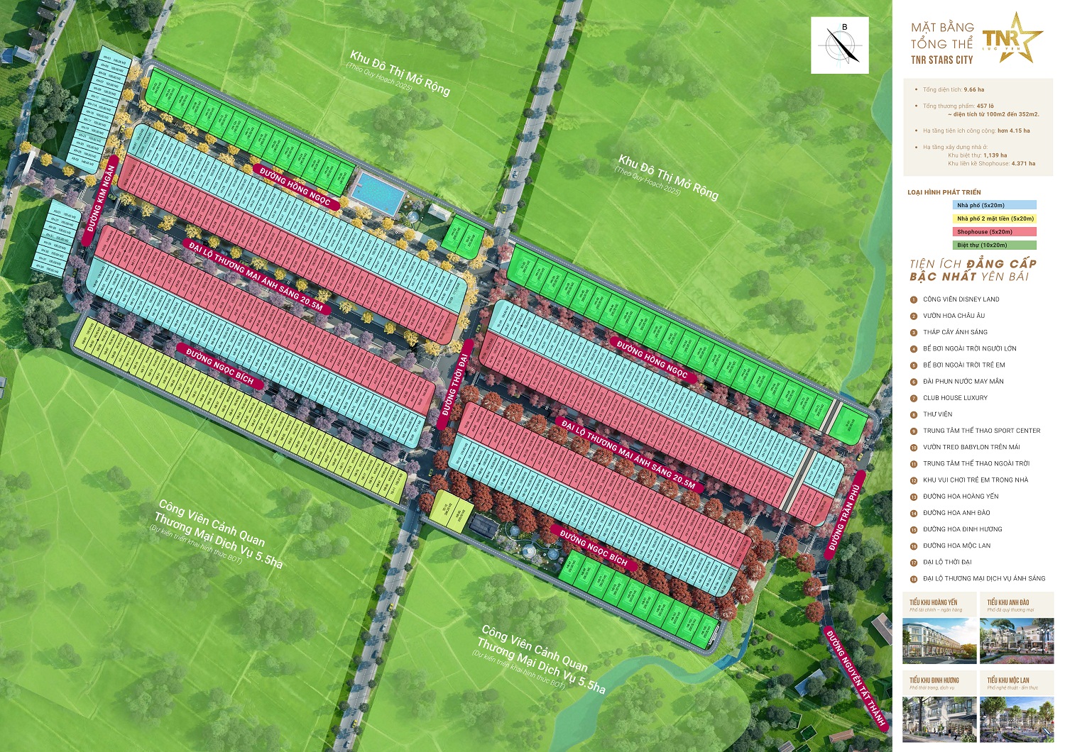 - TNR STAR CITY – TIỂU KHU HOÀNG YẾN: Hoàng Yến là tiểu khu sang trọng bậc nhất của TNR Lục Yên nơi thể hiện yếu tố vương giả bậc nhất bởi cảnh quan và hệ thống tiện ích đẳng cấp. Hoàng Yến thể hiện yếu tố uy quyền – hoàng gia của cả dự án – với màu vàng hoàng gia đặc trưng nơi tập trung những shophouse thương mại với biểu tượng tài chính & tiền tài sánh ngang với những kinh đô tài chính thế giới.