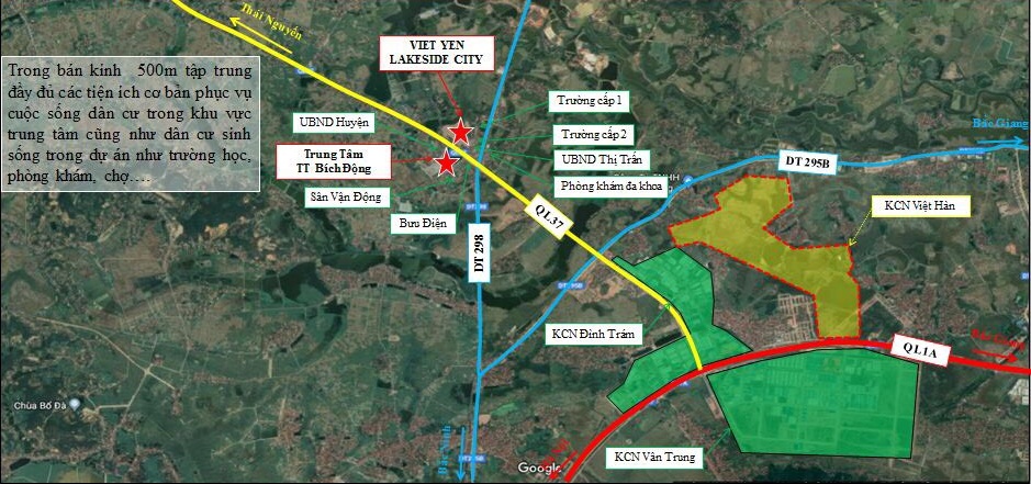 - Việt Yên Lakeside City nằm ở vị trí giao thương qua lại các khu công nghiệp với các tỉnh Thái Nguyên, Bắc Ninh, Lạng Sơn, Hà Nội…Khu 4 khu dân cư hứa hẹn sẽ trở thành trung tâm mới mang dáng vóc của một thành phố thu nhỏ.Thị trấn Bích Động – Việt Yên cũng sẽ trở thành trung tâm phát triển bậc nhất của tỉnh Bắc Giang.